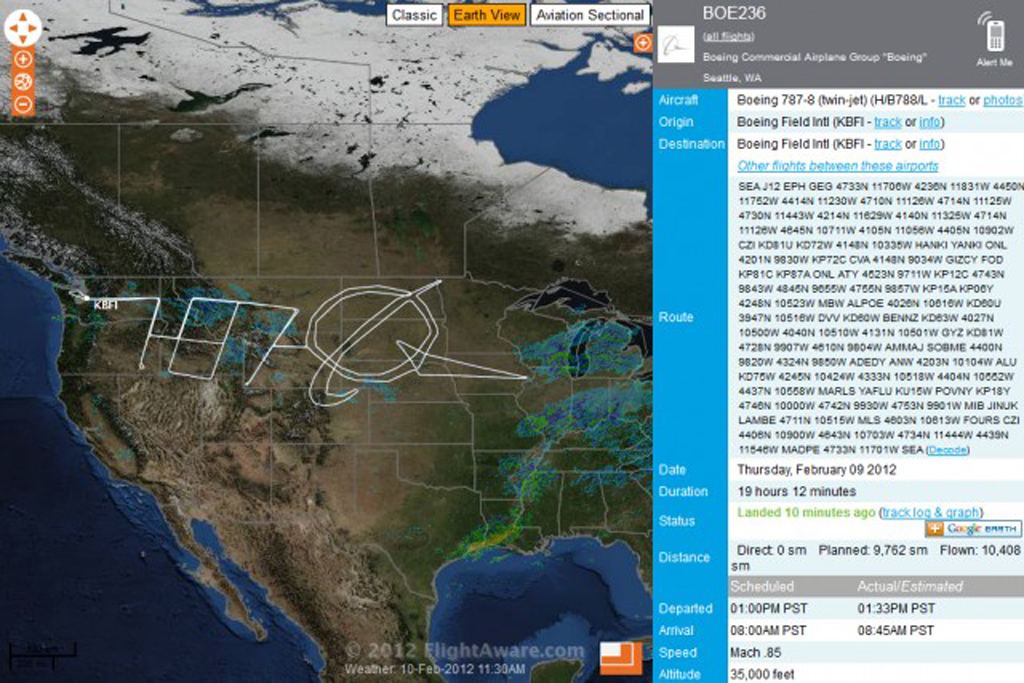 La última de estas demostraciones ha sido hace un par de días durante un vuelo de prueba para la certificación ETOPS del motor General Electric GEnx-1B del Boeing 787 Dreamliner de 19 horas de duración en el que aporvecharon, de nuevo, para pintar el cielo de Estados Unidos, esta vez con un “787″ y el logotipo de Boeing.